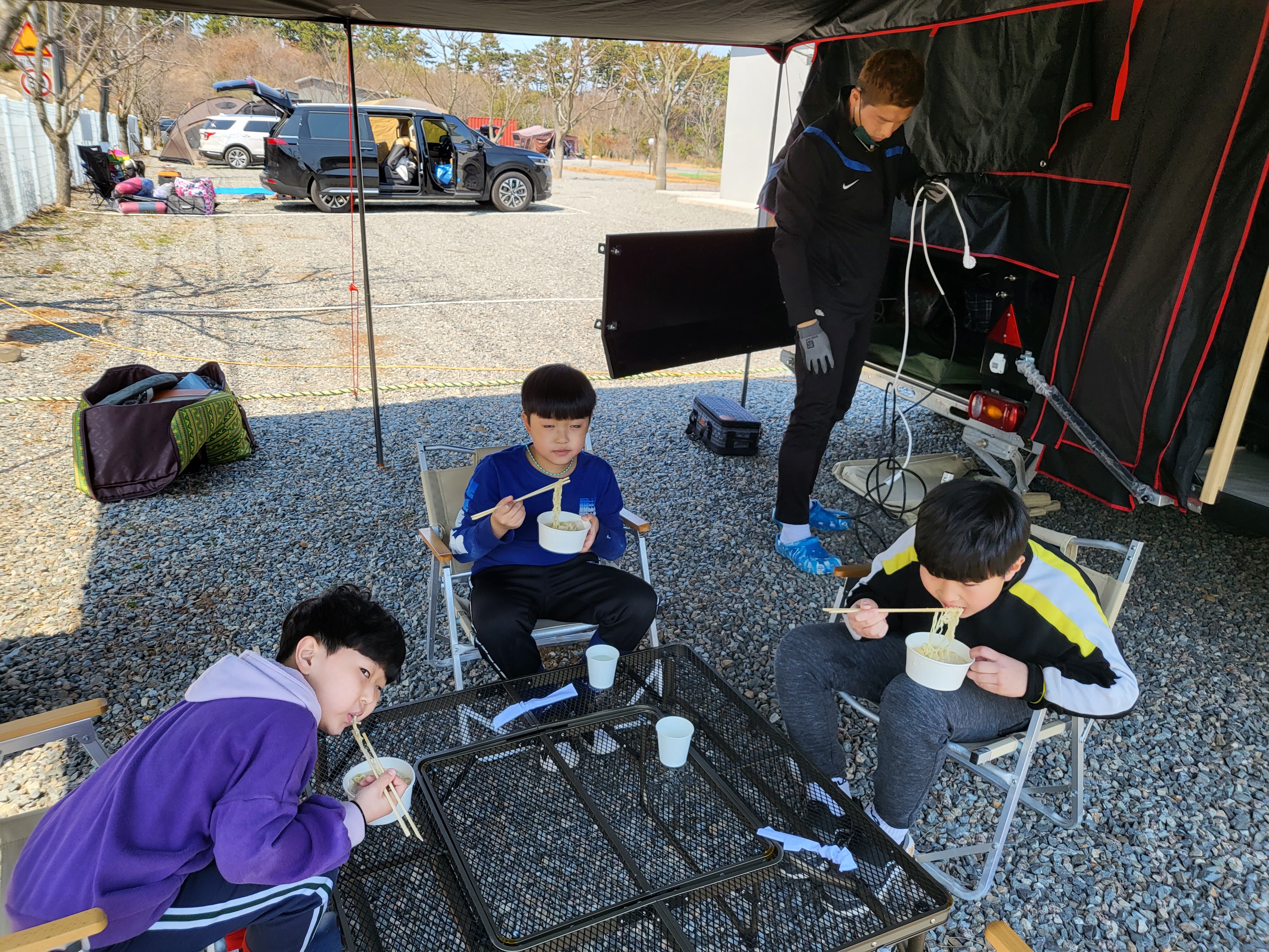 새벽부터 일어나 서울에서 태안까지 장거리를 이동하고 해루질로 체력까지 많이 쓴 아이들은 배가 고프다고 난리가 났습니다. 서둘러 캠핑장에 복귀 후 자리를 세팅하고 해루질 용품 및 장비들을 세척해 말려두었습니다. 저녁에 또 곰섬해수욕장에 해루질을 나가기로 했었거든요.
