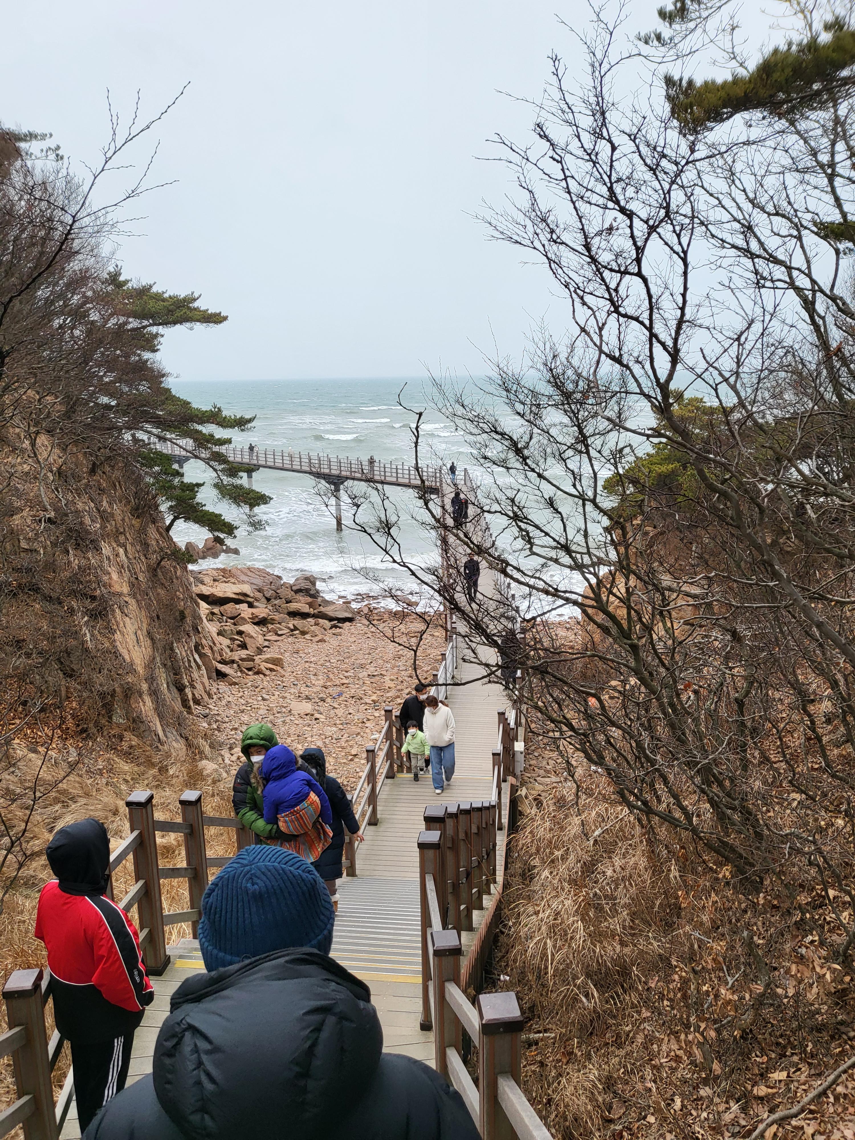 다른일행들을 기다리며 먼저 도착한 사람들은 하나개 해수욕장에 있는 해상탐방로를 따라 구경을 나섰습니다. 매서운 칼바람과 파도가 살짝 두려움을 주기도 했지만 너무 스릴있고 재미 있더라구요. 살벌하게 뒤집어진 바다도 구경하고 사진도 찍으며 해변까지 산책을 다녀왔습니다.
